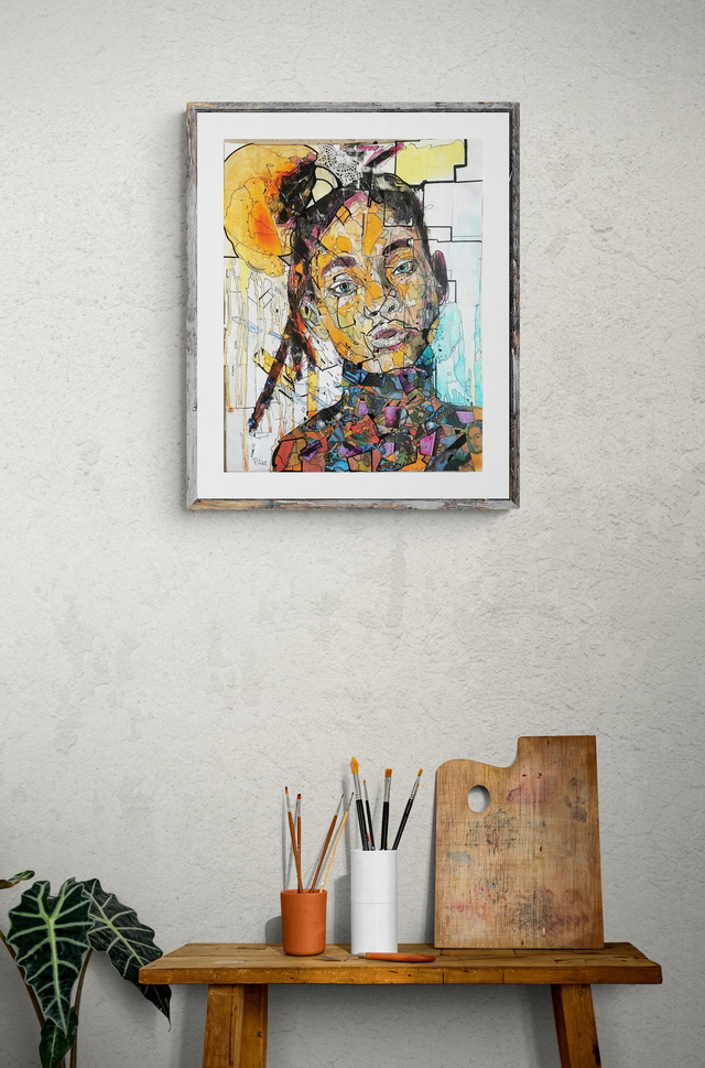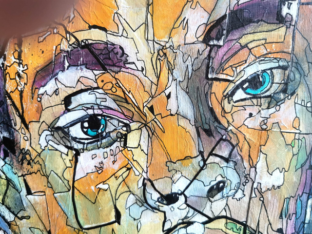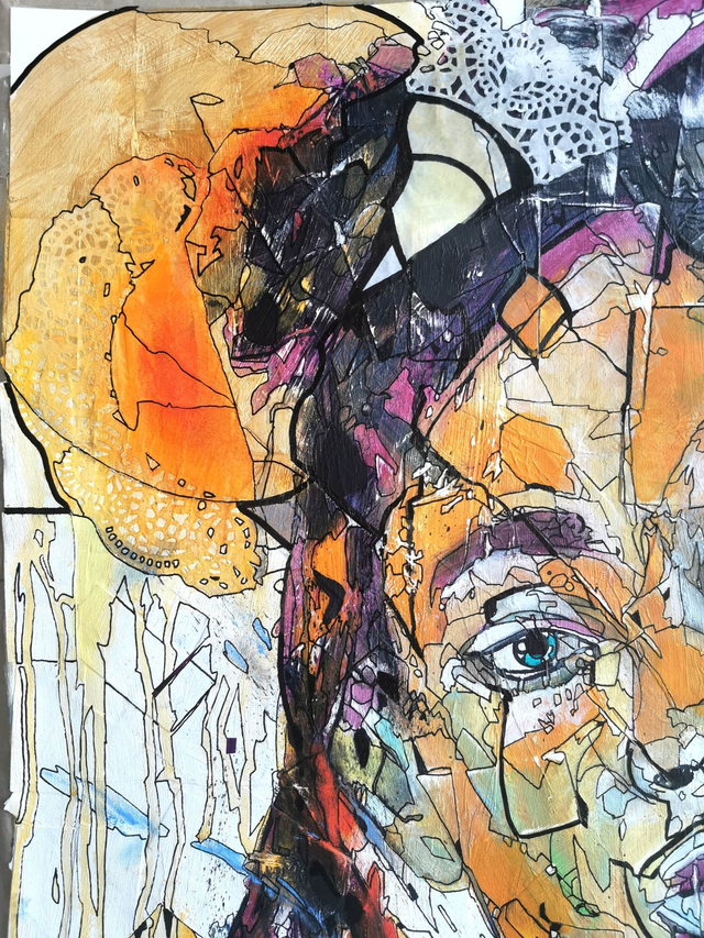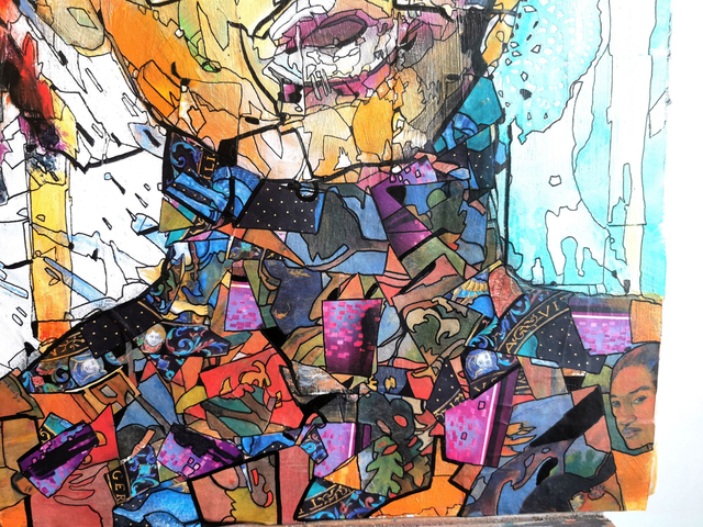 Tableau original 49 x 64 cm, acrylique, pastels et collages sur cartes de visite, sur papiers contrecollés